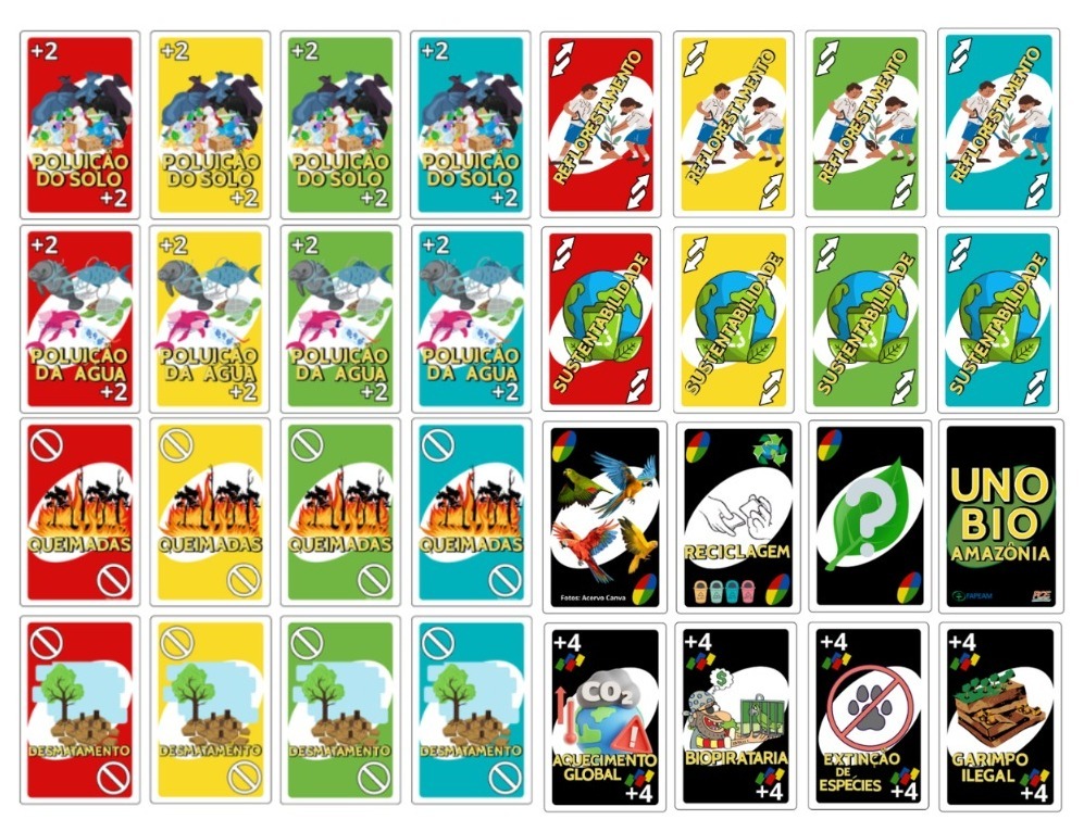 Com base nas informações coletadas, os estudantes selecionaram espécies e desenvolveram cartas para um jogo educativo utilizando a plataforma Canva. As regras do jogo foram adaptadas a partir do UNO original, com o objetivo de abordar temas relacionados a problemas ambientais de forma lúdica e interativa.