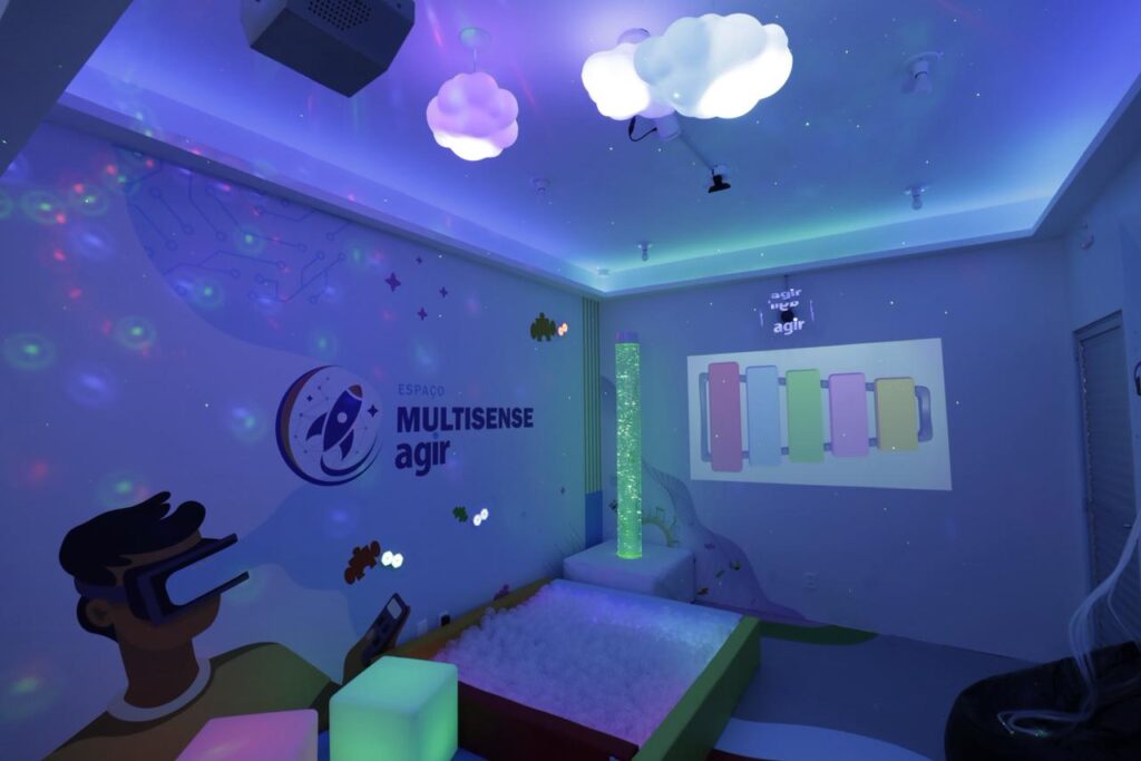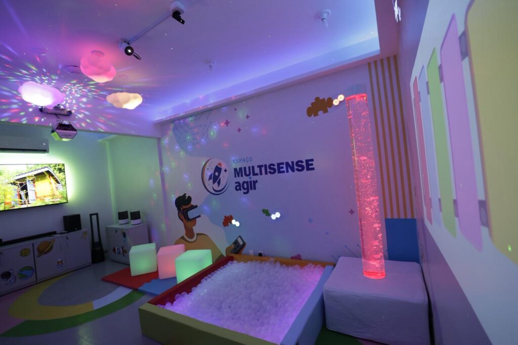 Entre os diferenciais da unidade estão os espaços especialmente projetados para promover estímulos sensoriais e o bem-estar das crianças. O Jardim Molhado é um ambiente lúdico que estimula o contato com a água e a natureza, contribuindo para o equilíbrio emocional e sensorial. Já a Sala Multisense oferece recursos de luz, som, texturas e estímulos controlados, favorecendo o relaxamento e a concentração durante as terapias.