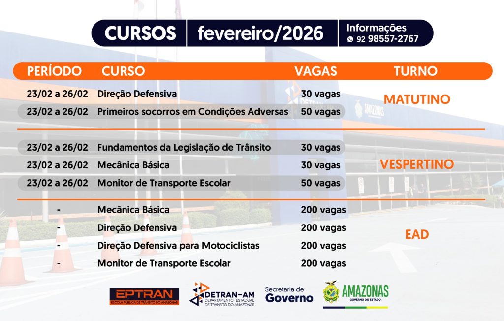 Por meio da Escola Pública de Trânsito (Eptran), o Detran-AM abre inscrições para os cursos gratuitos que serão promovidos ao longo do mês de fevereiro. No total, são 990 vagas disponíveis, com turmas nos turnos da manhã e tarde, e ainda cursos em Ensino à Distância (EaD).