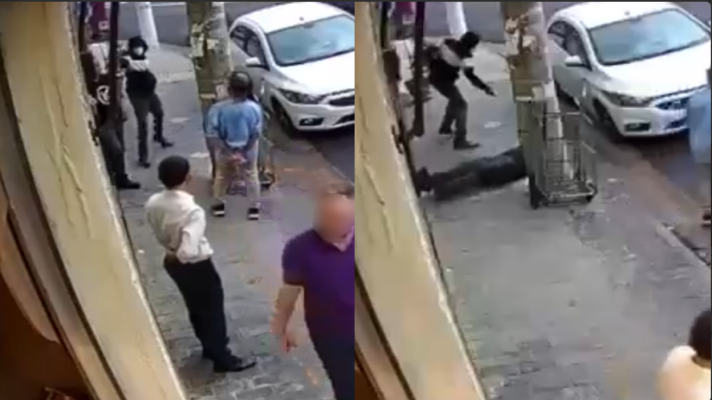 Imagens de câmeras de segurança mostram o momento do crime. No vídeo, é possível ver a vítima, identificada como Jorge José de Araújo, parada na calçada, conversando com outro rapaz logo a sua frente.