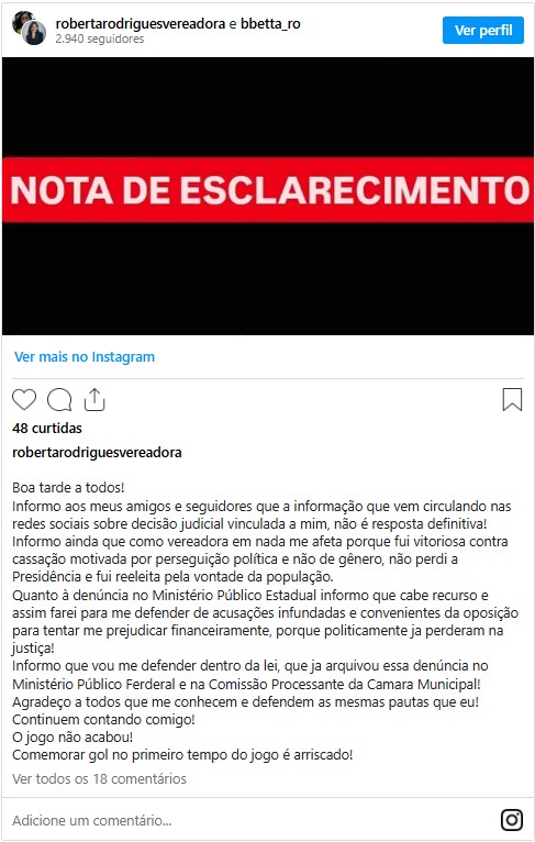 Em publicação feita nas redes sociais, a vereadora Roberta Rodrigues disse que vai recorrer da decisão e defender-se “de acusações infundadas e convenientes da oposição para tentar me prejudicar financeiramente”.