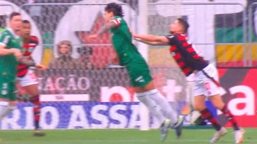 “Pra mim essa mão aqui é só uma mão de referência, não tem impacto. Wilton, pode seguir. Os dois braços dele estão estendidos e não fazem a flexão com impacto para o empurrão.” Análise do VAR em Flamengo x Palmeiras