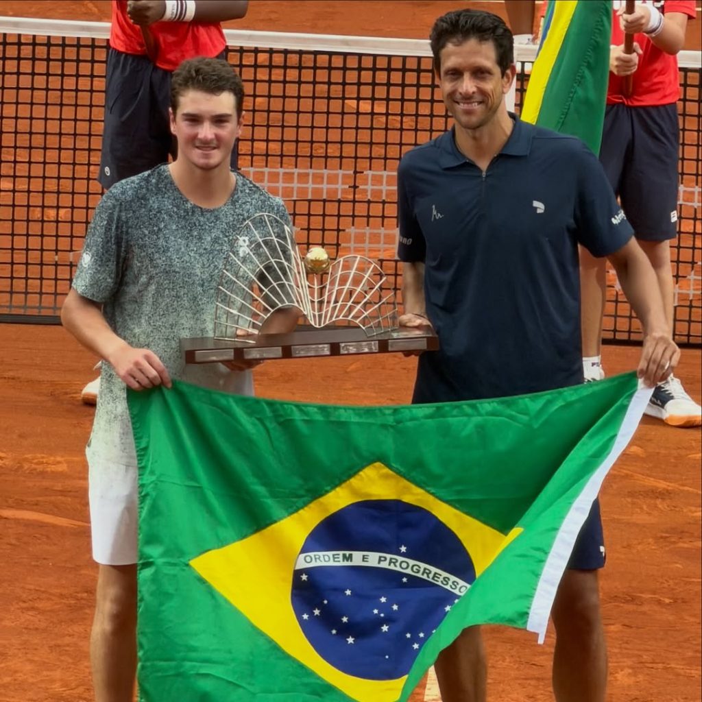 Em sua primeira final de duplas na carreira, João Fonseca conquistou mais um título inédito em seus poucos anos como tenista profissional. Desta vez, na mesma cidade que o criou. Ao lado do experiente Marcelo Melo, agora dono de 41 troféus na ATP, o jovem tenista de 19 anos viu o alemão Constantin Frantzen e o holandês Robin Haase confirmarem o primeiro set. Com uma reação imediata, a dupla de brasileiros dominou a segunda parcial e venceu a partida de virada por 2 sets a 1 (4/6, 6/1 e 10 a 8) em 1 hora e 33 minutos. Com casa cheia na quadra Guga Kuerten, Fonseca e Melo receberam o troféu das mãos de Andre Agassi e se consagraram os campeões do Rio Open.