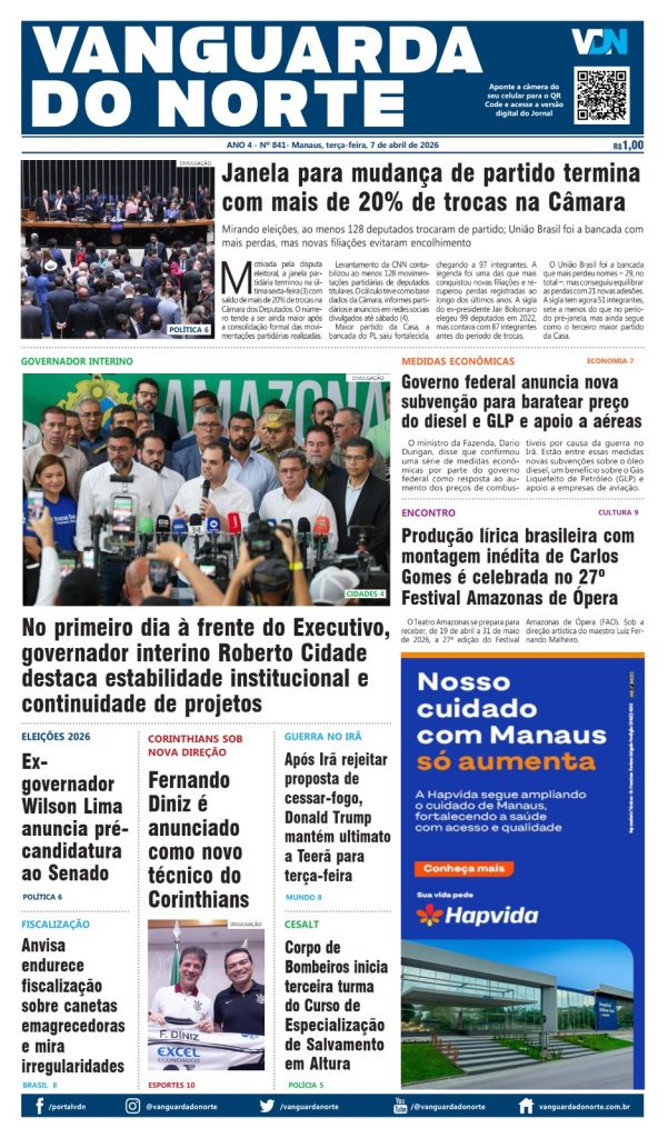 No primeiro dia à frente do Executivo, governador interino Roberto Cidade destaca estabilidade institucional e continuidade de projetos6 de abril de 2026