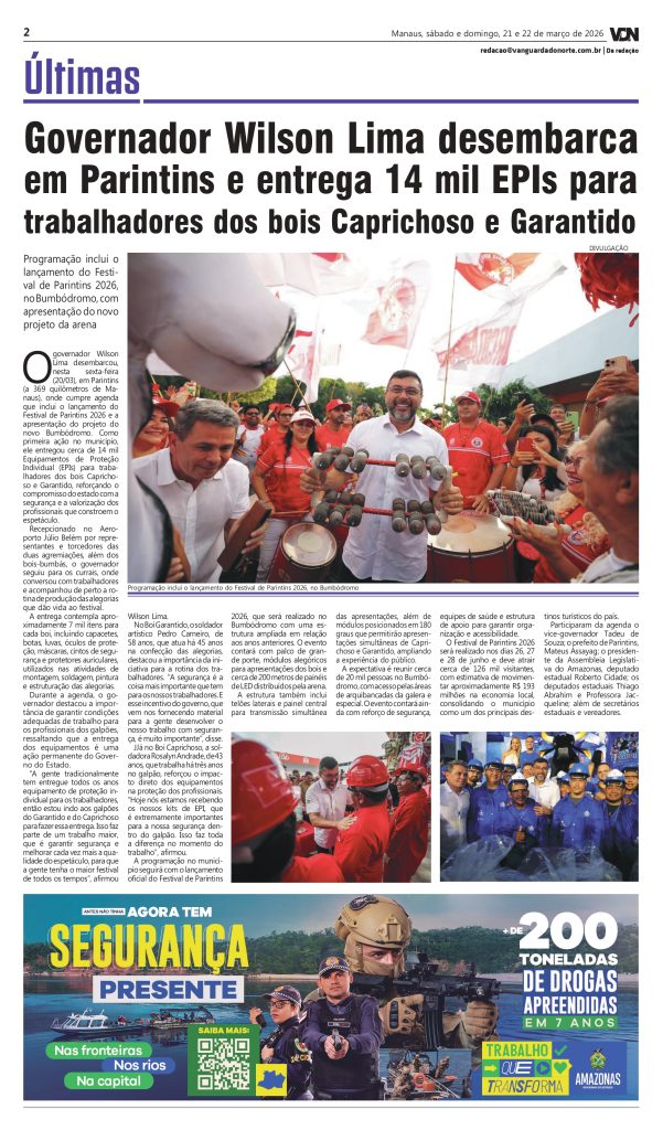Governador Wilson Lima desembarca em Parintins e entrega 14 mil EPIs para trabalhadores dos bois Caprichoso e Garantido20 de março de 2026