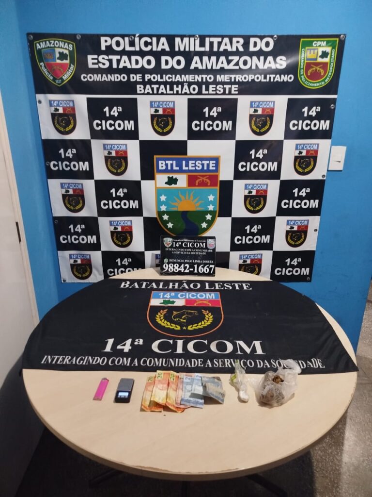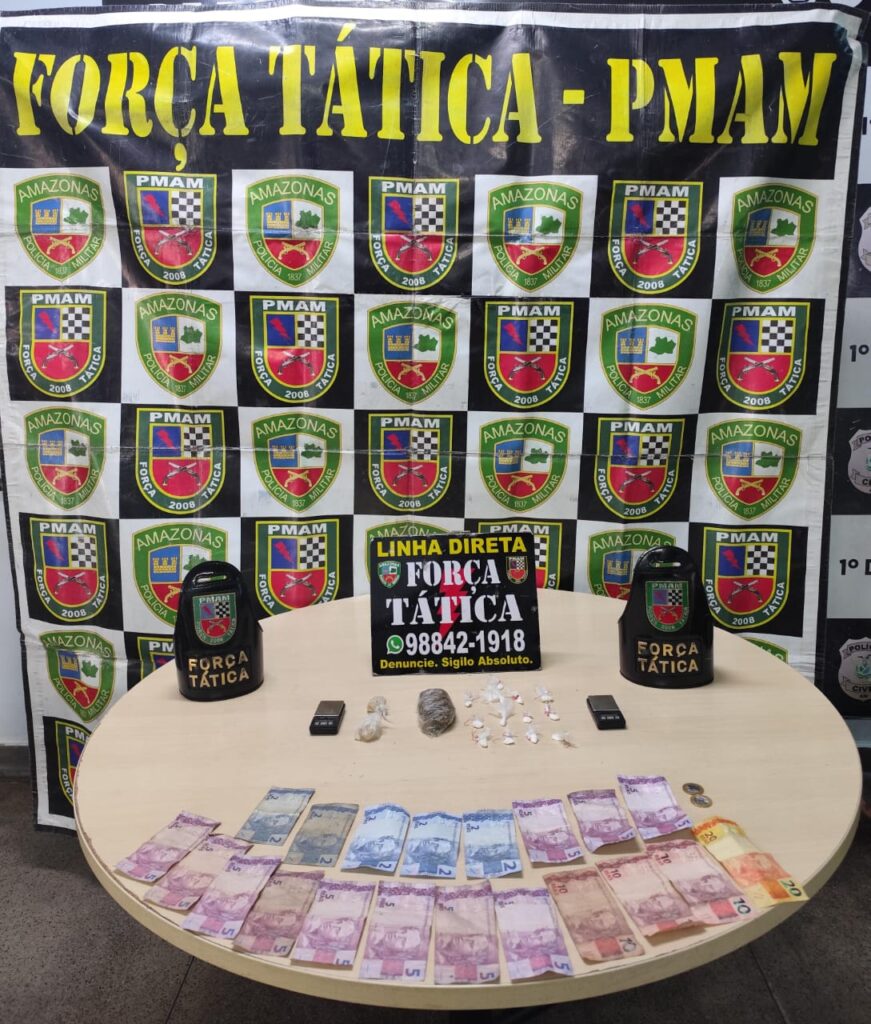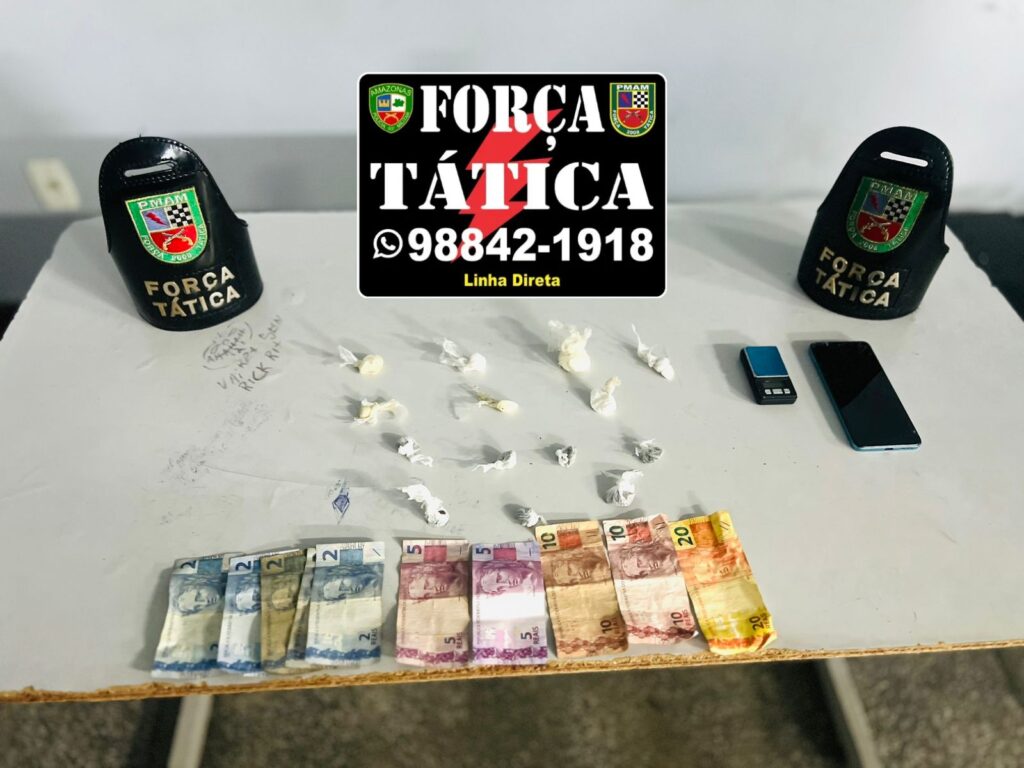 Já a no início da madrugada desta quinta-feira, a equipe da Força Tática realizava patrulhamento de rotina no bairro Novo Aleixo, quando abordou um homem, de 22 anos, em atitude suspeita, na travessa 10. Com ele, os PMs apreenderam uma porção média e três pequenas de cocaína, sete porções de maconha, três de oxi, além de uma balança de precisão.