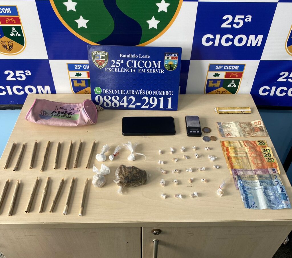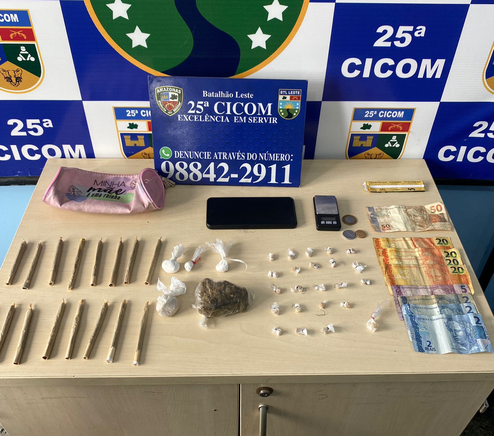 Já a no início da madrugada desta quinta-feira, a equipe da Força Tática realizava patrulhamento de rotina no bairro Novo Aleixo, quando abordou um homem, de 22 anos, em atitude suspeita, na travessa 10. Com ele, os PMs apreenderam uma porção média e três pequenas de cocaína, sete porções de maconha, três de oxi, além de uma balança de precisão.