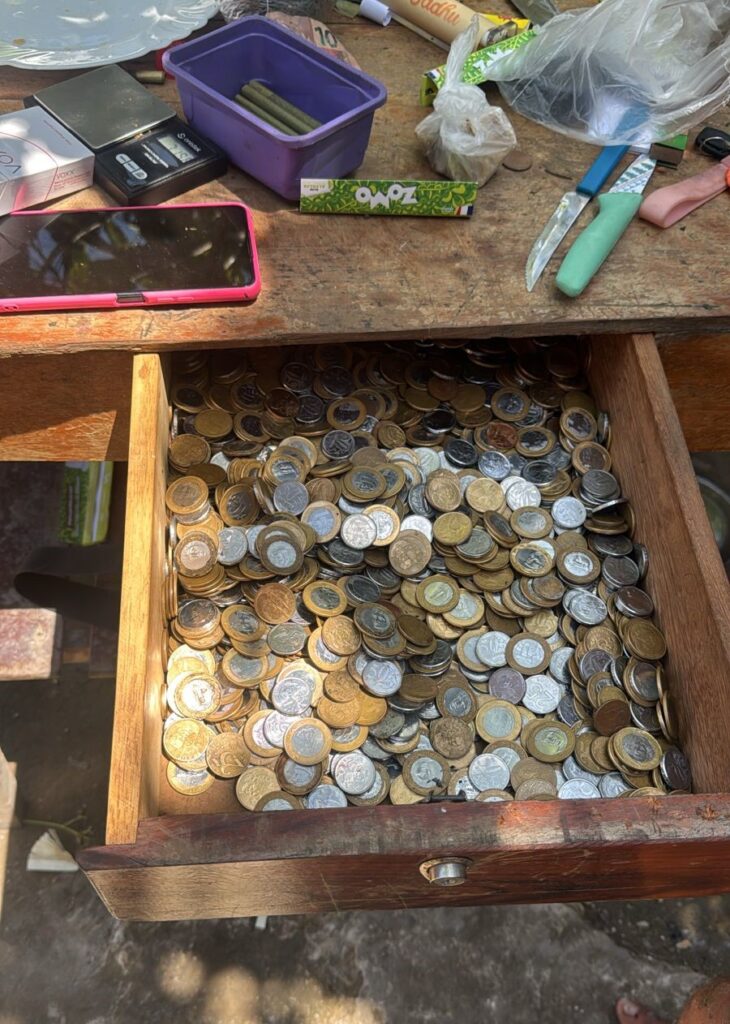 Conforme o delegado, no interior da residência foram apreendidos dois revólveres, um calibre 38 e outro calibre 32, além de entorpecentes e R$ 1.024,50 em moedas e R$ 278 em cédulas, totalizando R$ 1.302.