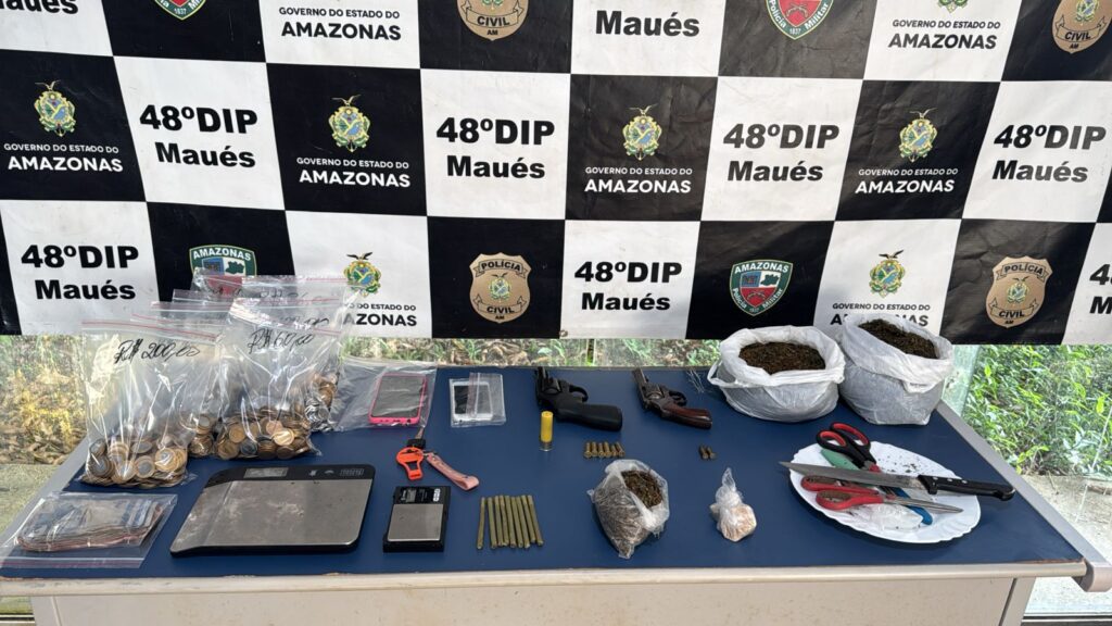 A Polícia Civil do Amazonas (PC-AM), por meio da 48ª Delegacia Interativa de Polícia (DIP) de Maués (a 276 quilômetros de Manaus), em ação conjunta com a Polícia Militar do Amazonas (PMAM), deflagrou, na quinta-feira (16/10), uma operação que resultou na prisão de quatro homens, de 18, 24, 32 e 34 anos, além da apreensão de armas de fogo, entorpecentes e R$ 1.302 em espécie.