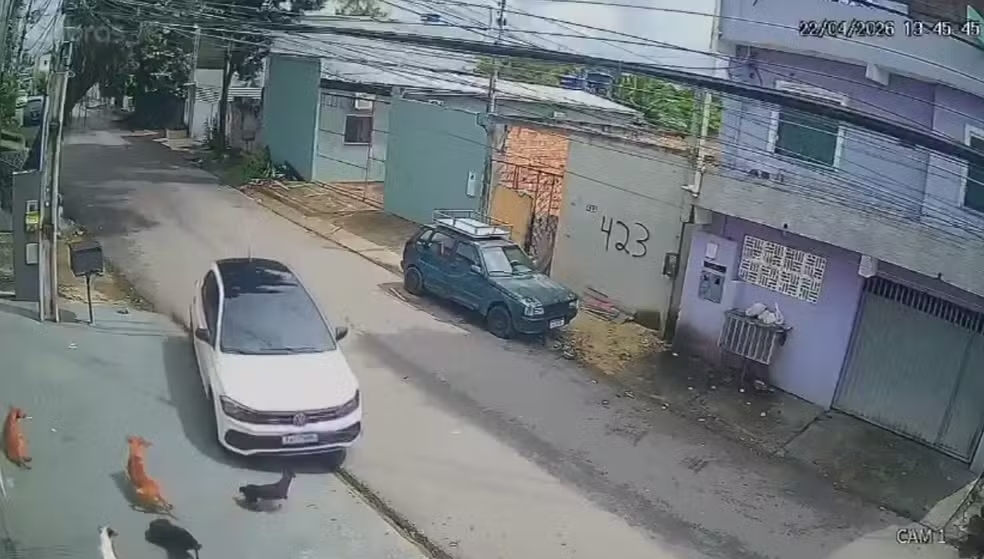 Imagens mostram seis cães deitados na calçada e outros dois na rua quando um carro branco surge em alta velocidade. O motorista invade a calçada e atinge os animais. Um dos cães é arremessado com o impacto, mas consegue se levantar e fugir com os demais.
