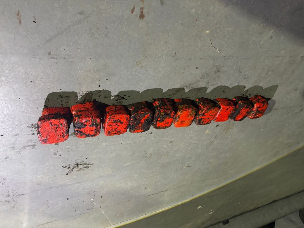 Durante os procedimentos, o cão policial Delta sinalizou para um compartimento na proa do barco. Nas buscas, a equipe encontrou, no interior de duas caixas de papelão, cerca de 20 tabletes de entorpecente.