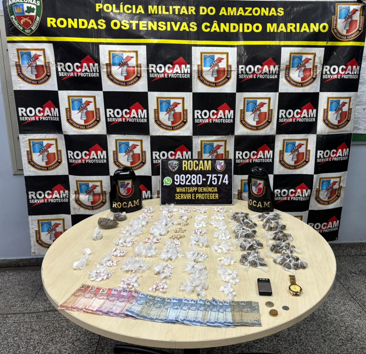 A Polícia Militar do Amazonas (PMAM), por meio das Rondas Ostensivas Cândido Mariano (Rocam), prendeu um homem de 28 anos, em posse de diversas porções de drogas, e capturou um foragido da Justiça, de 32 anos, na noite de domingo (26/04), na comunidade Parque Riachuelo 2, bairro Tarumã, zona oeste de Manaus.
