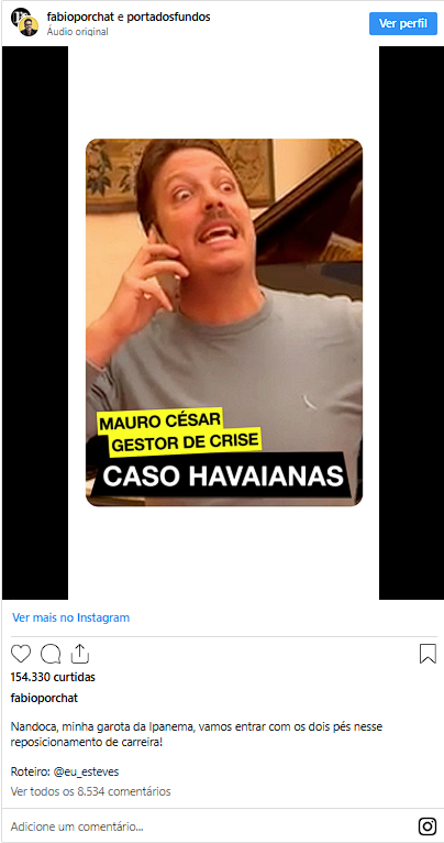 No vídeo feito em parceria com o canal Porta dos Fundos, Porchat interpreta um gestor de crise, que está mandando um recado para a atriz Fernanda Torres, que estrelou o comercial da Havaianas.