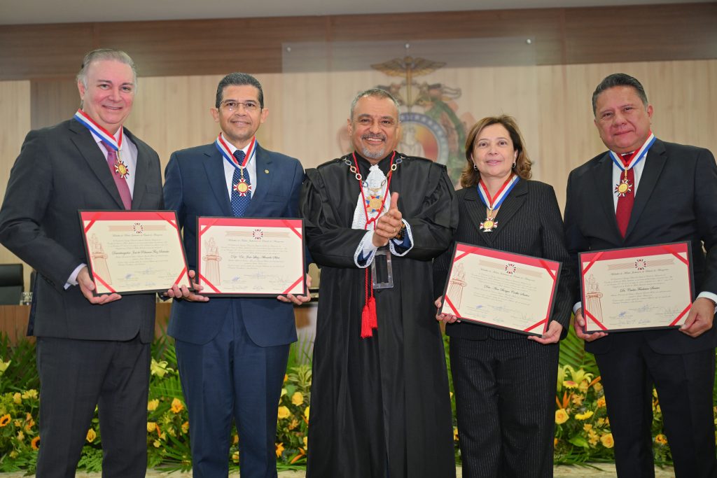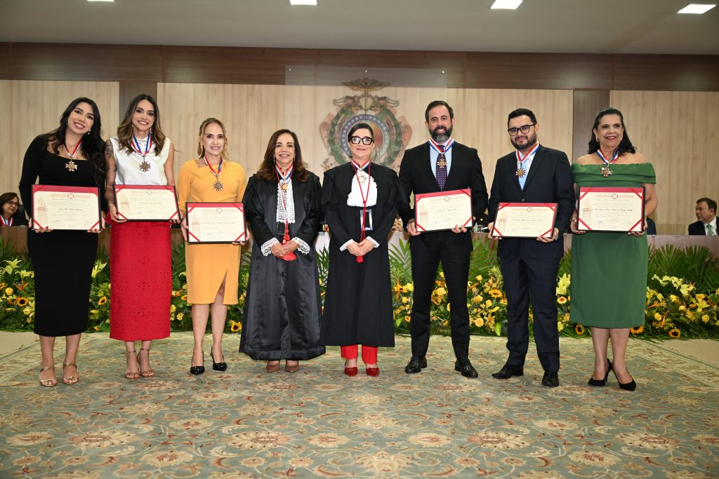 A seguir, os demais homenageados no grau ‘Mérito” foram: Cynthia Rocha Mendonça, assessora jurídica de juiz auxiliar da Vice-Presidência; Dalton Pedrosa Dos Santos, da Direção e Assessoramento Superior da Presidência; Izauriana Monteiro da Conceição, assessora jurídica; Camila da Silva Freitas, analista judiciária; Antônio Barros de Carvalho Júnior, analista judiciário; Andressa Kerolainy Oliveira e Silva, assessora de Cerimonial; Silvino Martins da Silva Neto, chefe de gabinete; Thaís Laura de Jesus da Silva Brandão, assessora judicial; tenente QOAPM José Cláudio Cândido de Almeida; tenente QOAPM Geziel da Silva do Vale; 2.º sargento QPPM Flávio Silva Ramos; Therezinha de Jesus Santos, servidora aposentada do INSS; André de Azevedo Machado, chefe de gabinete do corregedor nacional; Luís Felipe de Araújo Flôr, secretário-geral da Corregedoria-Geral de Justiça do Amazonas; Maria Tereza Botinelly Martins Ribeiro, chefe de gabinete da Corregedoria; Vera Helena Campbell Marques, servidora da Justiça Federal; Renata Simonetti Teixeira, assessora jurídica; Jade Calda Tolentino, assessora de gabinete; Fernando Almeida Mota, servidor do TJAM; Marcos Felipe Pena da Silva e Silva, servidor do TJAM; Adelina da Cunha Parente Bisneta, ex-diretora geral do MPAM, e Laura Maria Mitouso de Araújo Litaiff, servidora do TJAM.