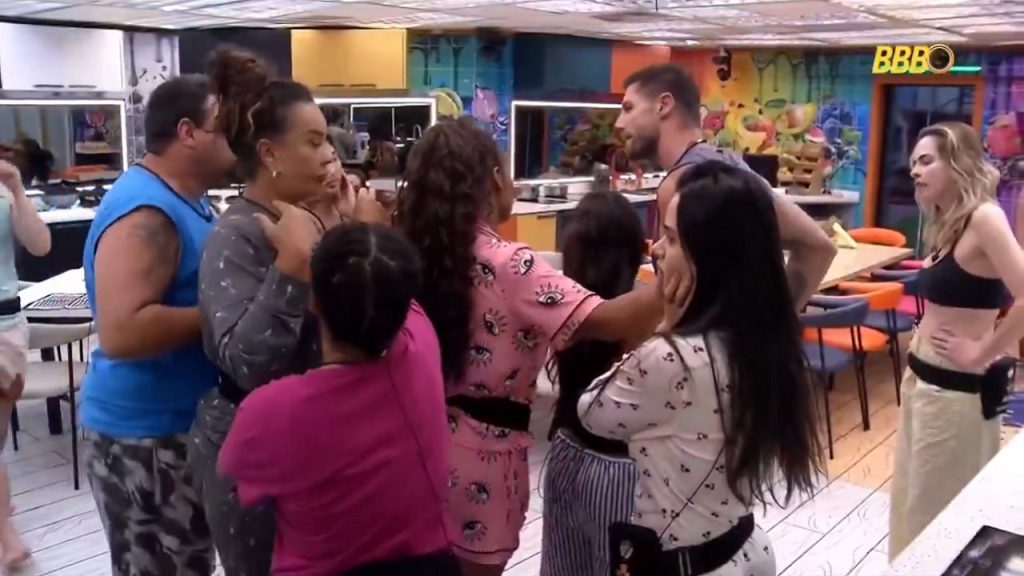 A recreadora mexia no fogão quando o ex-BBB 12 e o ex-BBB 20 começaram a bater boca e fica entre os dois, com um garfo na mão. Ao perceber que o clima está esquentando, Solange Couto se mete no meio e recoloca Milena no fogão.