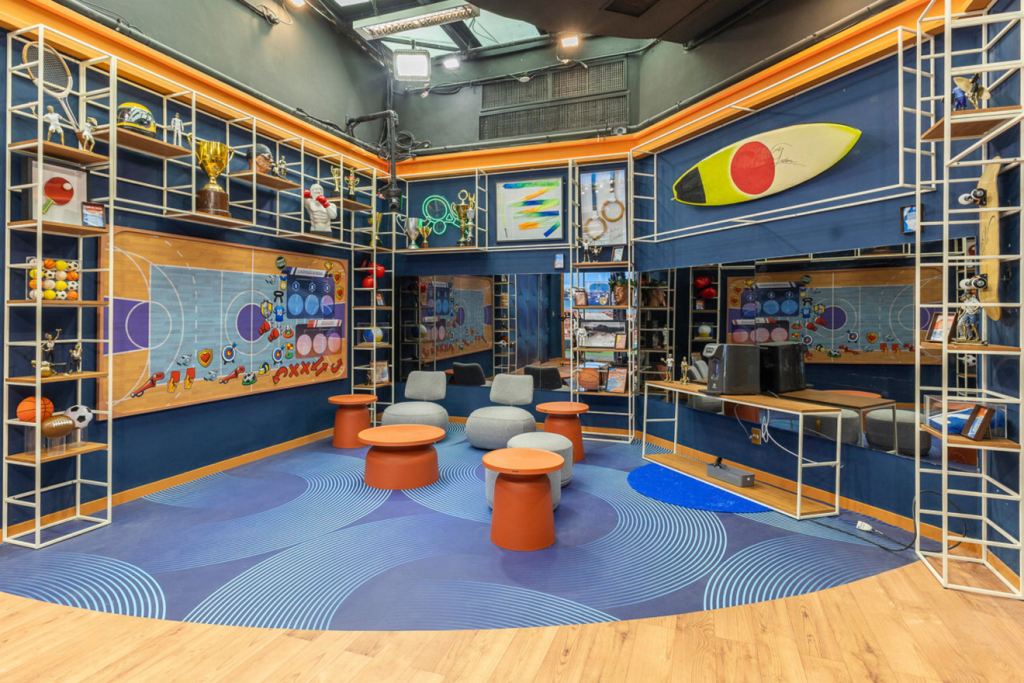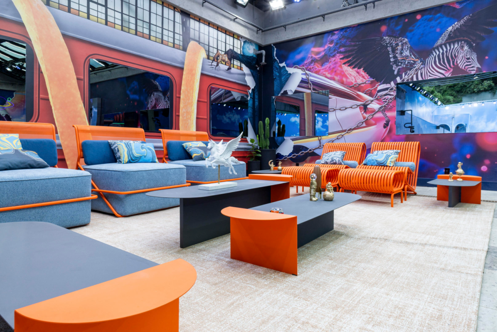Para sala de estar, cenário da reunião diária entre os brothers e o apresentador, Tadeu Schmidt, foram escolhidas as cores azul turquesa e dourada, com um sofá no estilo vintage e uma mesa de centro recheada de cédulas de reais. A porta do confessionário remete a um cofre, e, no seu interior, estão lingotes e pilhas de ouro, além de uma poltrona dourada — representando o sonho do prêmio.