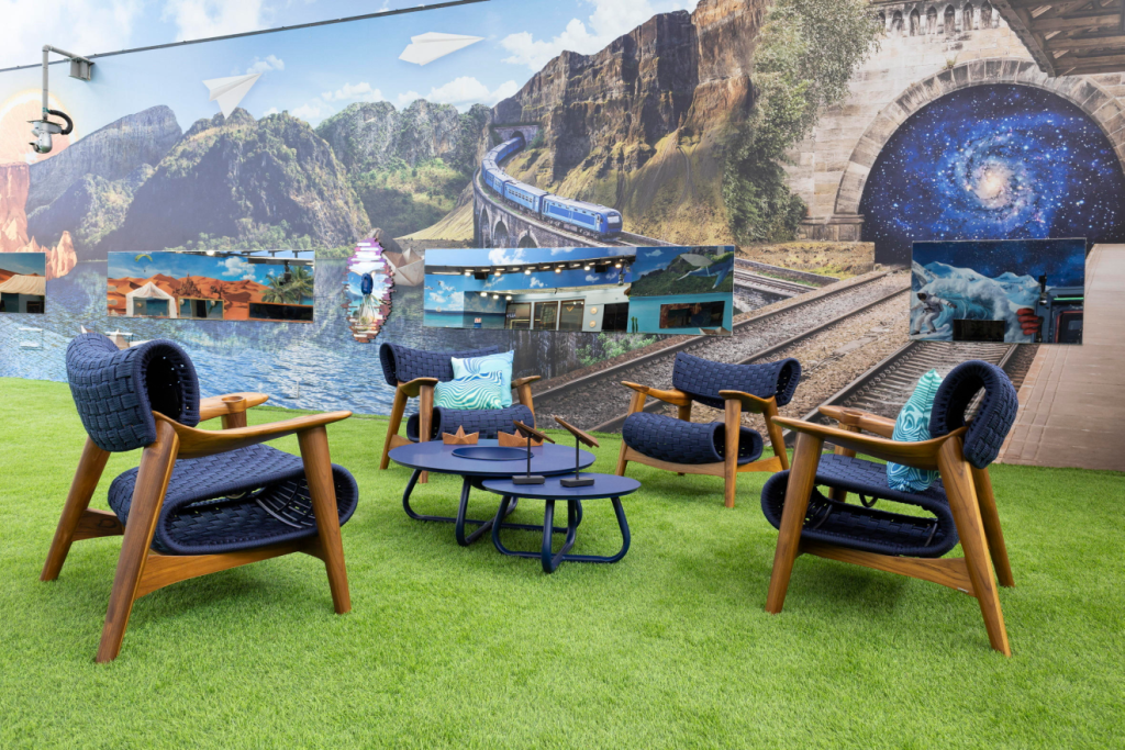 A área externa foi inspirada nos sonhos que envolvem aventuras, com estampas de deserto, geleira, praia e espaço sideral. O sol foi representado em formato de laranja e mãos de monstros fazem as transições lúdicas entre ambientes.