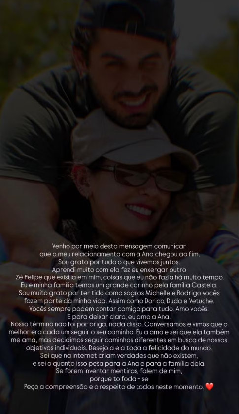 “Venho por meio desta mensagem comunicar que o meu relacionamento com a Ana chegou ao fim. Aprendi muito com ela. Ela fez eu enxergar outro Zé Felipe que existia em mim, coisas que eu não fazia há muito tempo. Eu e minha família temos um grande carinho pela família Castela. Sou muito grato por ter tido como sogros Michelle e Rodrigo, vocês fazem parte da minha vida. Assim como Dorico, Duda e Vetuche. Vocês sempre podem contar comigo para tudo. Amo vocês. E, para deixar claro, eu amo a Ana”, disse o cantor.